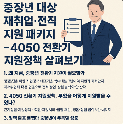 우리 사회의 중심축이자 가장 많은 경력을 쌓은 세대, 바로 40~50대 중장년층입니다. 그러나 빠르게 변화하는 산업 구조와 고용 환경 속에서 이들이 새로운 일자리를 찾는 일은 점점 어려워지고 있습니다. 최근에는 기업 구조조정, 조기 퇴직, 업종 전환 등으로 인해 제2의 직업 인생을 준비해야 하는 중장년층이 늘고 있는데요. 이에 정부와 지자체는 ‘4050 전환기 지원정책’이라는 이름으로 중장년의 재취업 및 전직 지원 패키지를 확대 시행하고 있습니다.